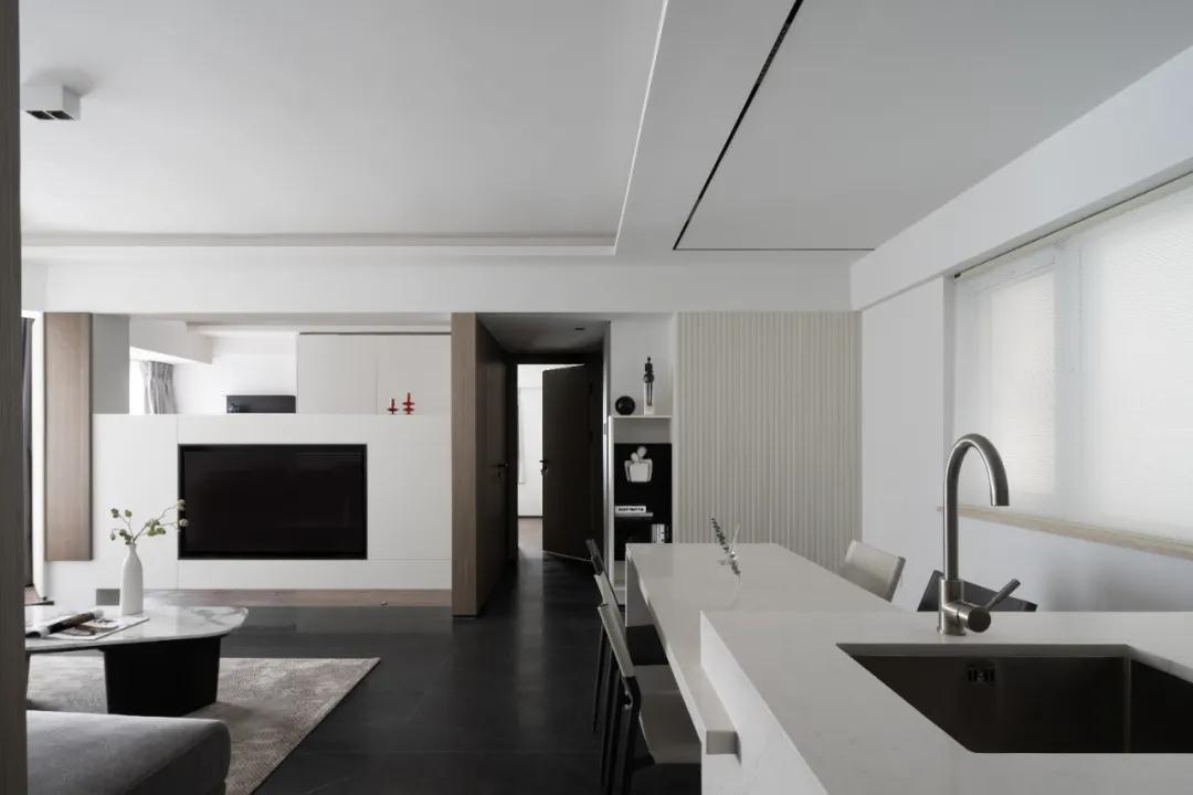 在承載了重要生活場景的餐廚區域,設計師直接把玻璃門和墻體打掉之后,開放式廚房搭配島臺設計,將整個餐廚空間融為一體,顯得通透、明亮。通過輕松簡約的造型與黑白灰的色調來呈現空間里的都市感。