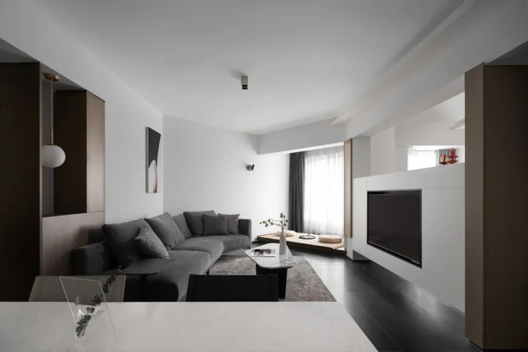 不規則沙發+半墻電視柜,地臺打造休閑空間
