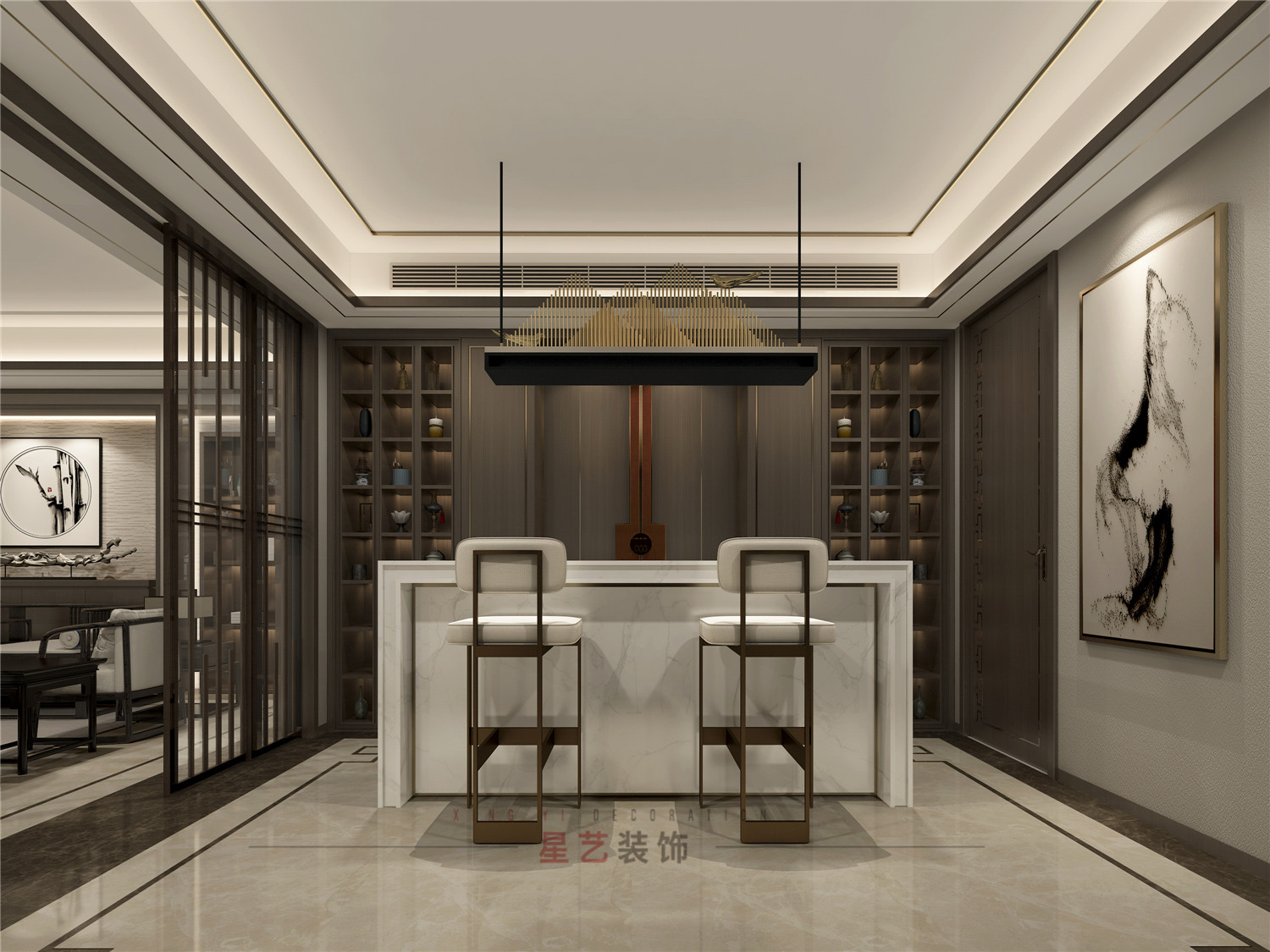 吧臺用鏤空屏風隔斷劃分出一篇日常的休閑區,吊燈設計的像是連綿起伏的遠山,留白的墻壁用水墨暈染的掛畫裝飾,用中西結合的設計手法營造出山水寫意的美感。