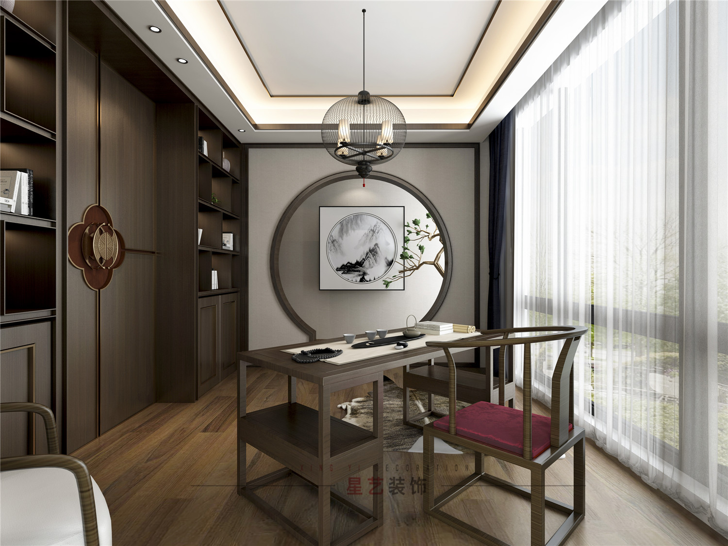 書房采用燈籠形狀的吊燈的,并且拱門也是一大亮點,用水墨畫與盆栽做裝飾,顯得格外清幽雅致。