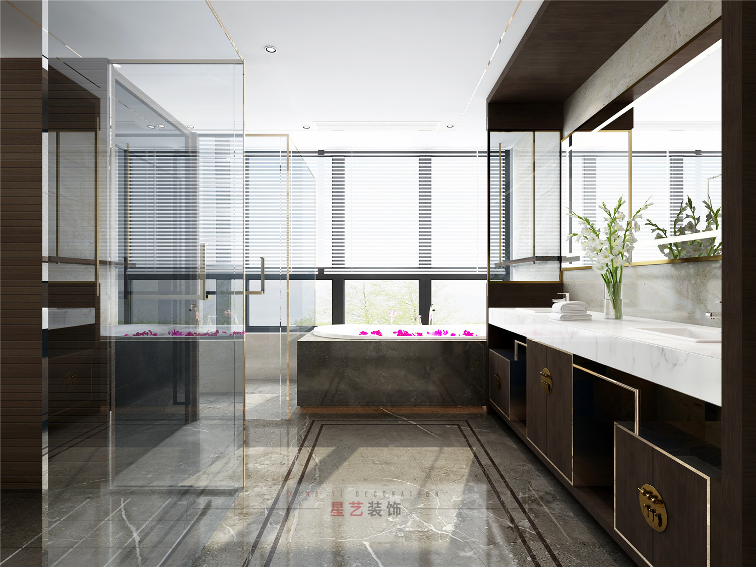 主衛大面積的百葉窗和玻璃門來打造出虛實結合,層次分明的空間,在舒舒服服泡澡的時候也能欣賞窗外的風景,開闊的視野更能讓人放松身心。