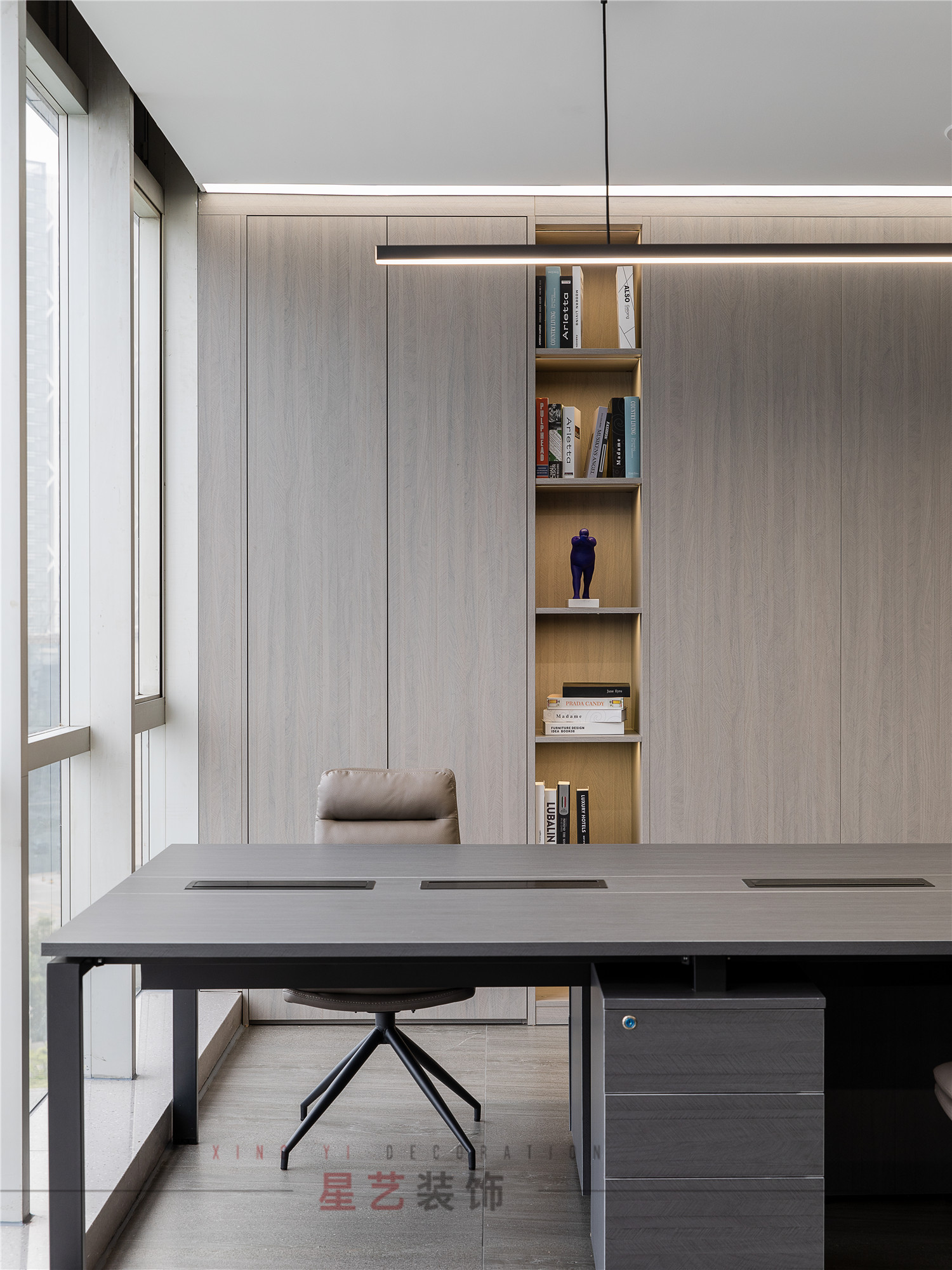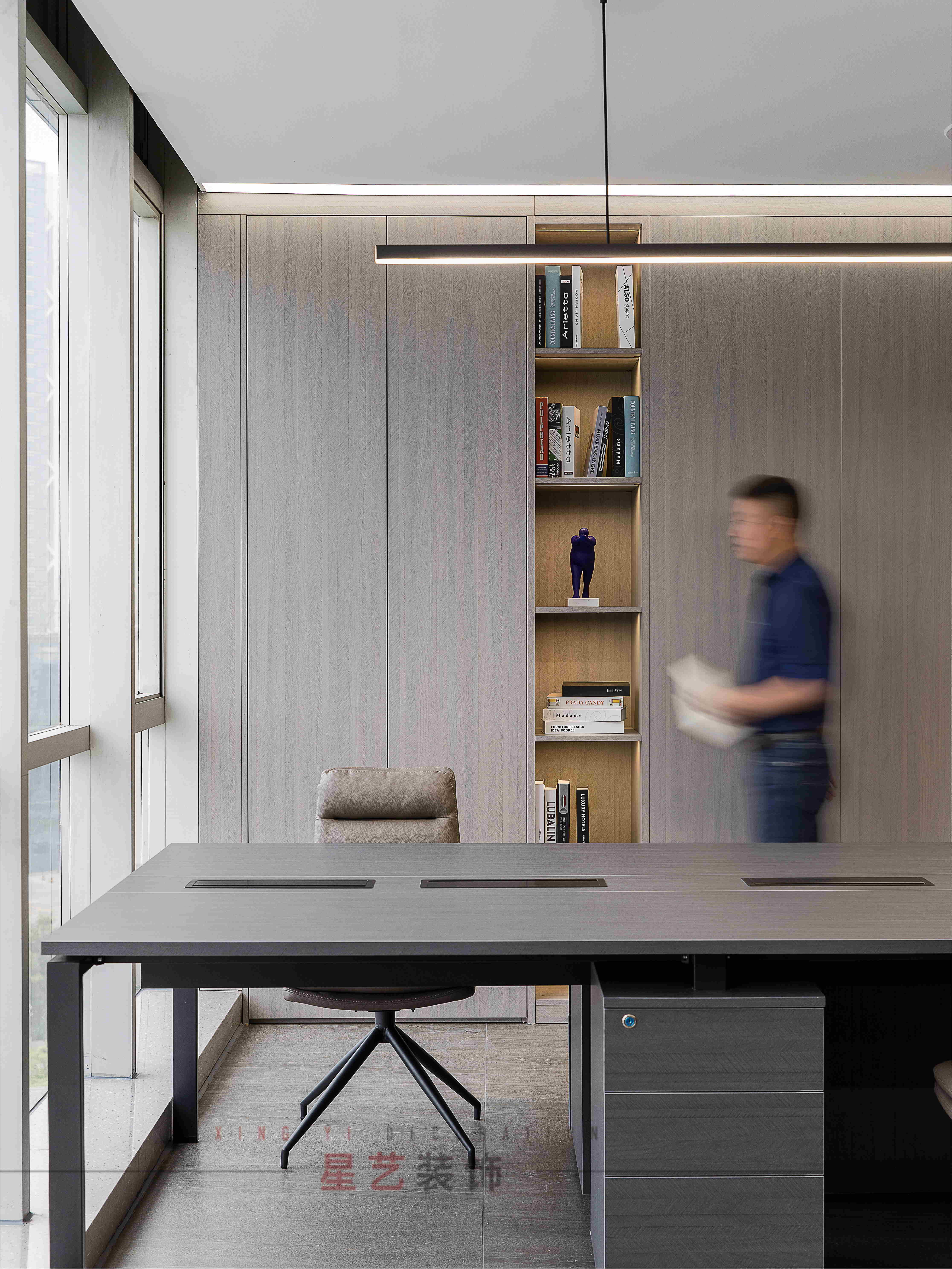 會(huì)議區(qū)也可作為接待區(qū),休息區(qū),學(xué)習(xí)區(qū),隱形儲(chǔ)物柜實(shí)用又美觀,整面的落地窗讓整個(gè)空間干凈明亮,既能享受家的愜意,也能減少工作帶來(lái)的的浮躁與不安。