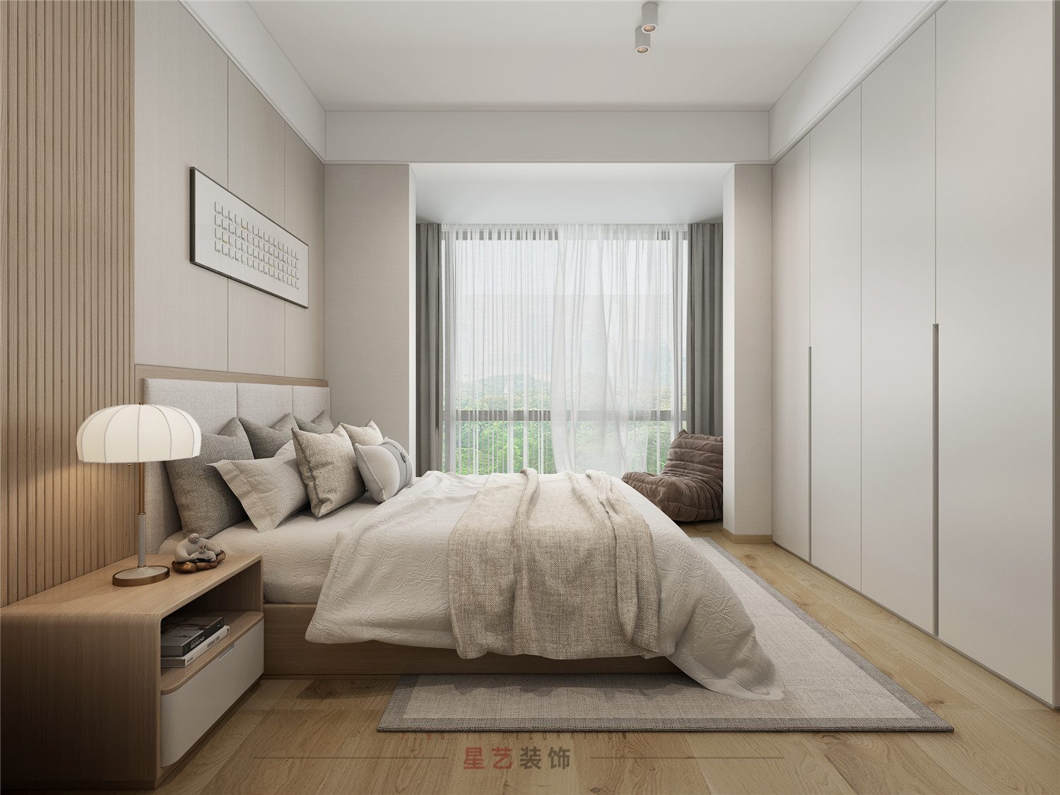木制紋理地板搭配棉麻風格的床上用品